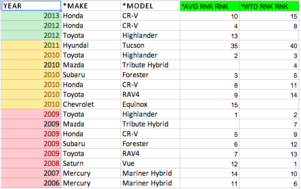 [NOTE: You’ll notice that the 2011 Hyundai Tucson is also listed even though it held rankings of 35th and 40th. That’s because one of our options was to potentially purchase my wife’s parent’s Tucson from them, so I wanted to see how it measured up to the competition.]