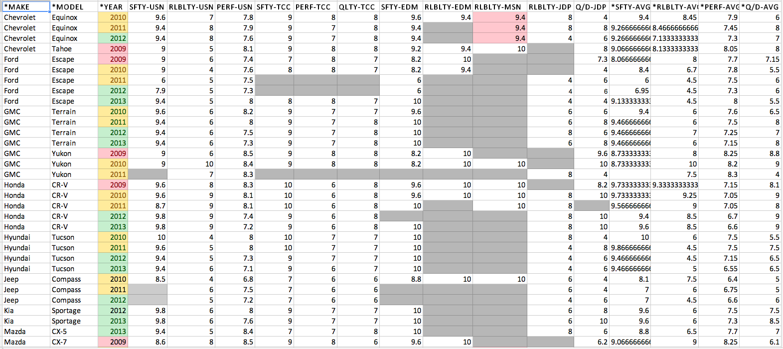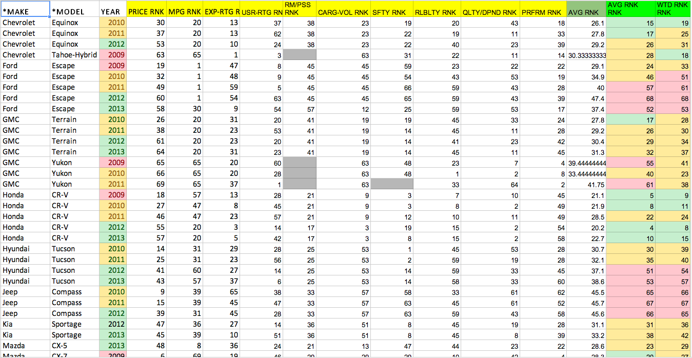 In case your mind is mush after reading that, here’s what that told me: The 2011 GMC Terrain, for instance, had an average ranking of 29.2, meaning that it averaged a ranking of 29th across all the categories, compared to the other SUVs. To put it into even clearer perspective, that average ranking of 29.2 was the 26th highest average ranking among all the SUVs.